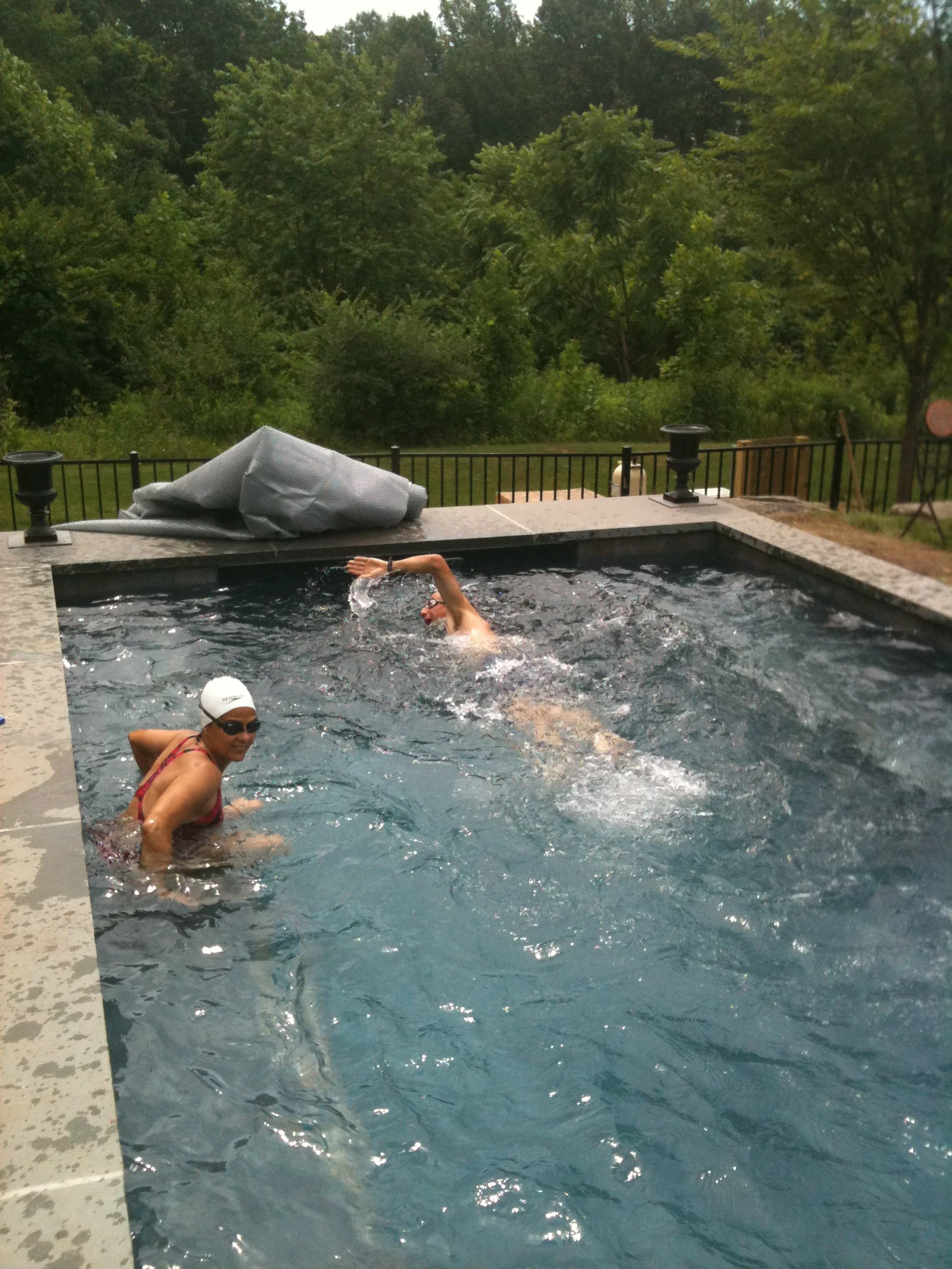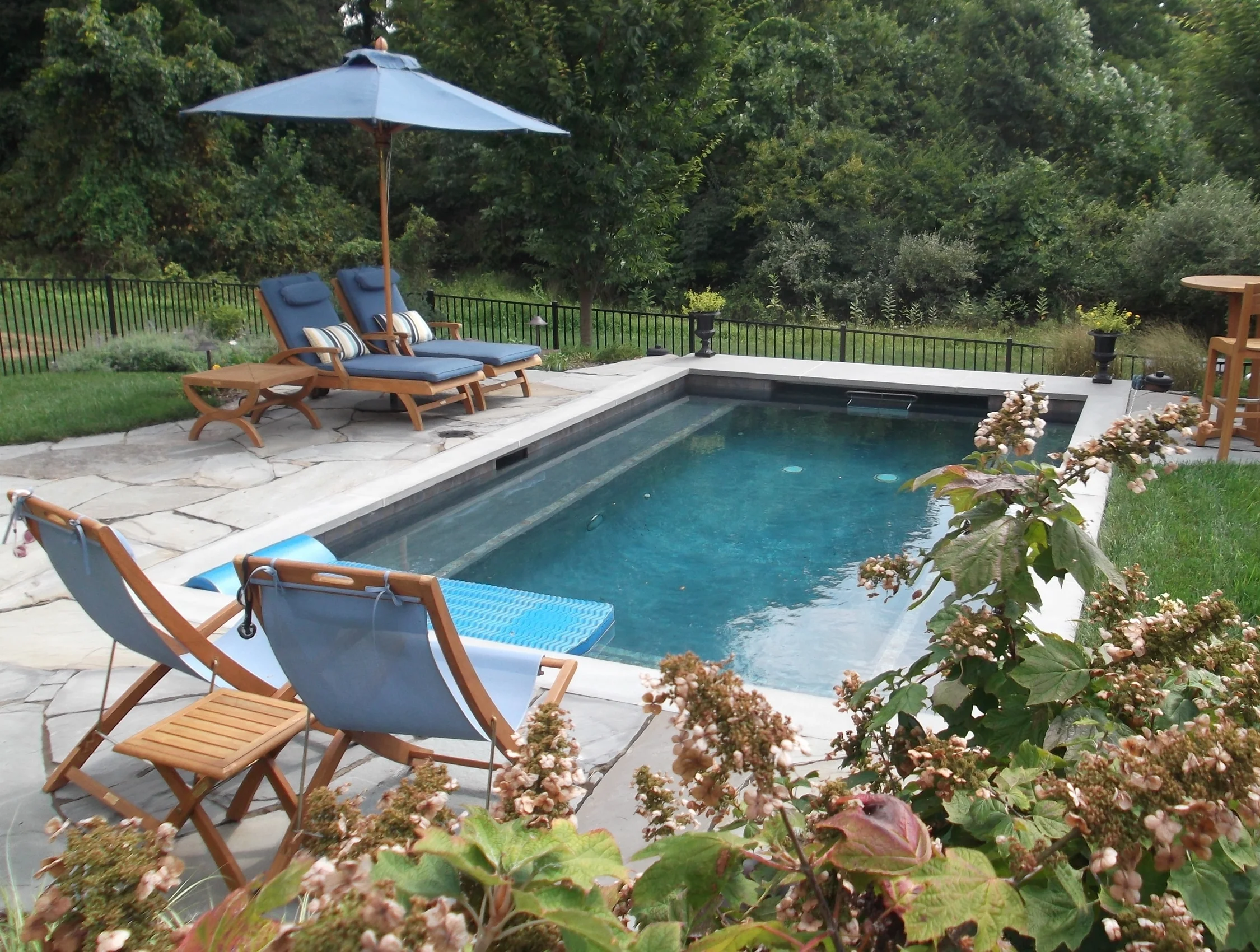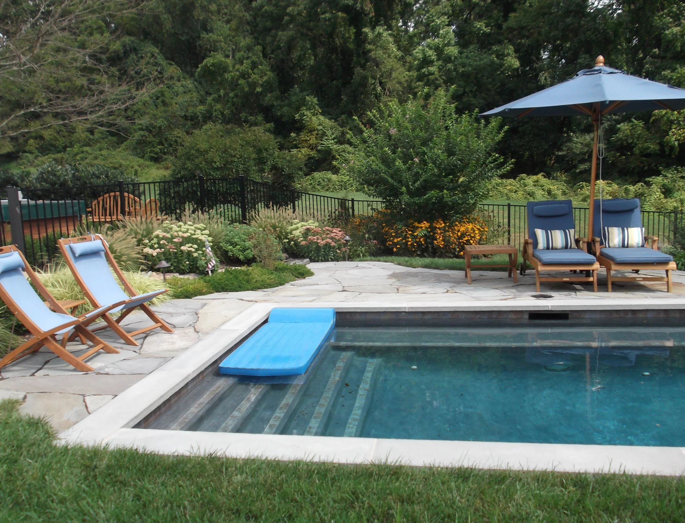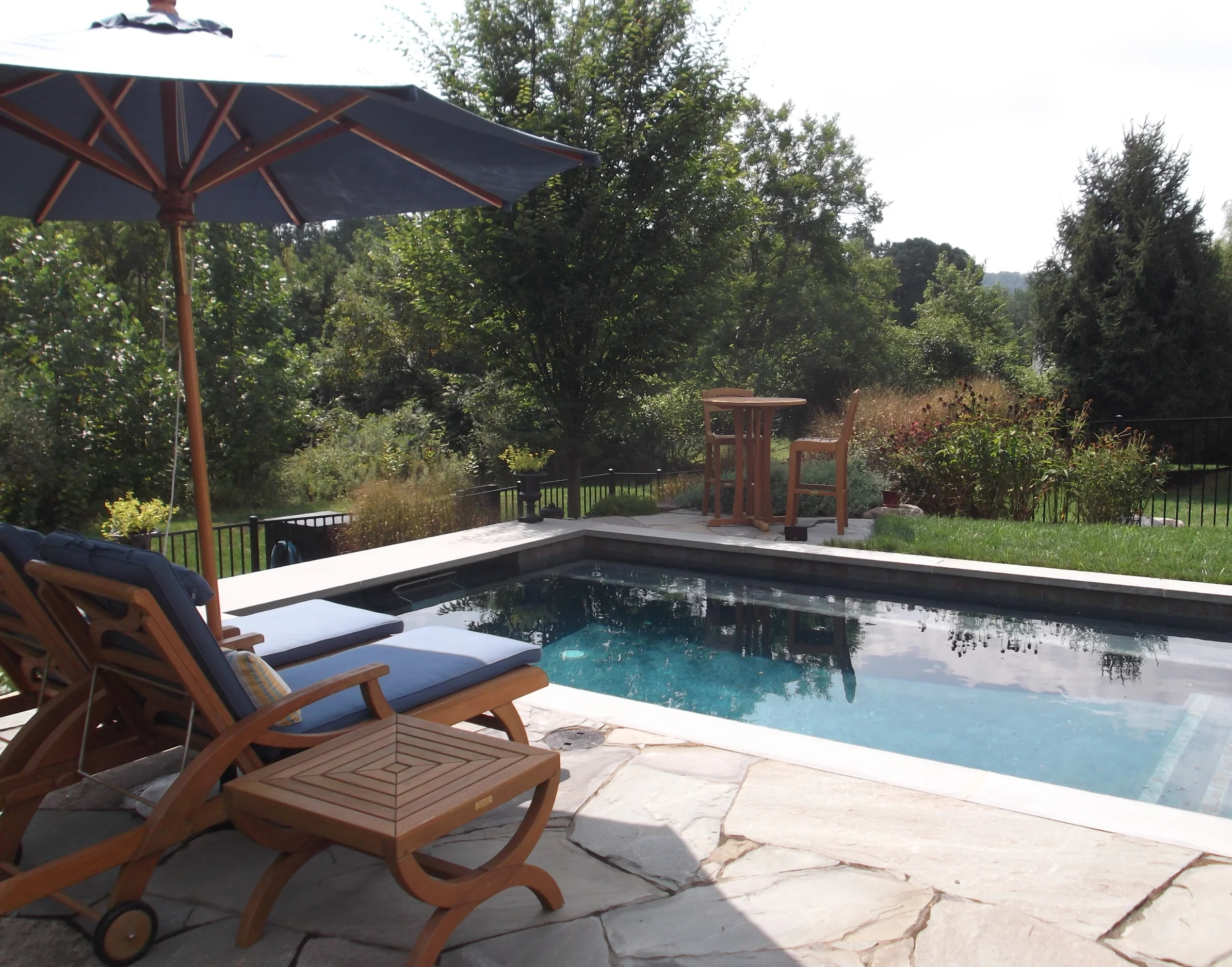 This custom pool is more than meets the eye. Mark Eberhardt of Stillwater Landscape Associates, designed this pool to integrate perfectly into the side yard. The clients are avid swimmers and this pool was designed around the Fastlane propultion unit by Endless Pools. Carefully tucked under the far end coping this propultion system allows continuous swimming against the current which is controlled by a handheld remote. Other features include, on the near end, a full width set of steps to enter the pool, as well benches down both sides. A truly versatile pool you can sit and cool off with your favorite drink, splash and play or get you daily swim workout.